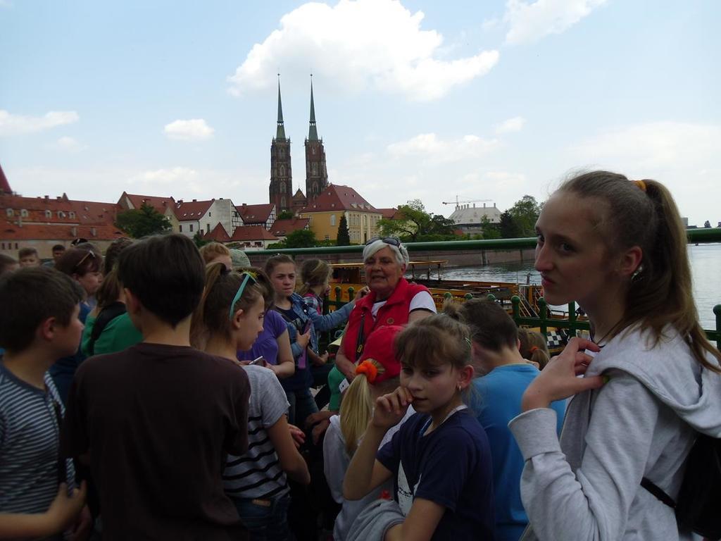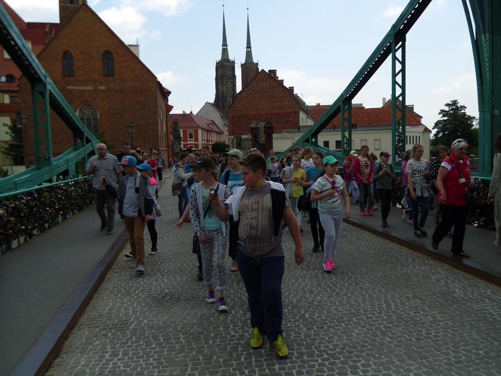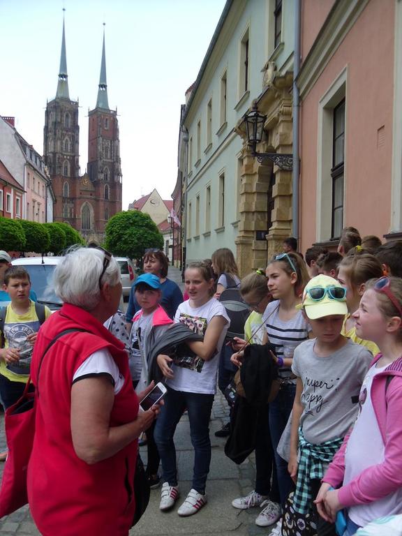 Następnie uczniowie wybrali się na trzygodzinny spacer po mieście z przewodnikiem, gdzie oglądali na Ostrowie Tumskim gotycką katedrę św. Jana Chrzciciela oraz kościół Świętego Krzyża. Później Mostem Tumskim (potocznie nazywany także Mostem Zakochanych) dotarli na Rynek Główny pełen barokowych kamienic, starannie zrekonstruowanych po drugiej wojnie światowej oraz Plac Solny. Pani przewodnik przybliżyła również dzieciom historię świątyń różnych wyznań (katolickich, greckokatolicki, prawosławnych i protestanckich). Podczas spaceru uczniowie szukali w różnych miejscach krasnali, których jest tu blisko trzysta.