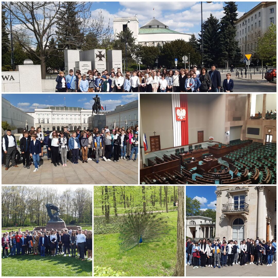 28 kwietnia 2023 r. uczniowie naszej szkoły byli na wycieczce w Warszawie. 50 uczniów z klas IV-VII skorzystało z zaproszenia Pana Posła Grzegorza Wojciechowskiego i miało możliwość zwiedzania siedziby Sejmu. Pobyt w stolicy rozpoczął się od wizyty w Łazienkach Królewskich. Dzieci zwiedziły Pałac na Wyspie, Amfiteatr oraz spacerowały po ścieżkach Ogrodu Królewskiego, Ogrodu Romantycznego i Ogrodu Modernistycznego. Następnie po rejestracji gości i skomplikowanej procedurze bezpieczeństwa dzieci w towarzystwie przewodniczki rozpoczęły zwiedzanie gmachu Sejmu. Trasa zwiedzania obejmowała przejście podziemnym korytarzem, gdzie prezentowana była wystawa dotycząca sejmowania w okresie I Rzeczpospolitej, a także makieta współczesnego kompleksu budynków sejmowych. Wizyta na galerii Sali Posiedzeń Sejmu połączona była z ciekawym wykładem dotyczącym historii i współczesności polskiego parlamentaryzmu. W holu głównym obejrzeliśmy pamiątkowe tablice poświęcone nieżyjącym już parlamentarzystom. Zwiedzanie Sejmu zakończyliśmy w stołówce sejmowej, gdzie zjedliśmy smaczny obiad. Spacer po Starym Mieście oraz obserwacja zmiany warty przy Grobie Nieznanego Żołnierza to ostatnie punkty naszego wyjazdu.