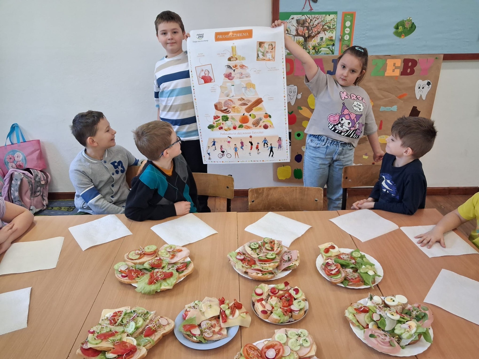Odżywiamy się zdrowo i kolorowo! Pod takim hasłem uczniowie klasy 2 przywitali wiosnę. Przygotowali wspólnie zdrowe i kolorowe kanapki. Zadbali o kondycję, sylwetkę i zdrowe zęby.